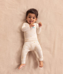 Perfect for in-between seasons this mid-weight fabric offers just the right balance of warmth and breathability. Soft, natural cotton with a touch of elastane to support your baby's movements offering a snug, yet flexible fit for natural sleep positions.