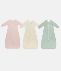 This bundle includes 1 x Sleep Bag Long Sleeve 1.0 TOG Cotton Powder Pink Twinkle, 1 x Sleep Bag Long Sleeve 1.5 TOG Cotton Oatmeal Twigs and 1 x Sleep Bag Long Sleeve 1.5 TOG Cotton Olive Twigs