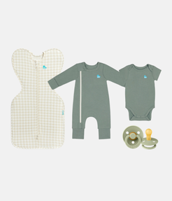 This Spring Newborn Bundle includes 1 x Swaddle Up™ 1.0 TOG Cotton Tan Houndstooth, 1 x Romper Viscose from Bamboo Deep Olive, 1 x Bodysuit Short Sleeve Viscose from Bamboo Deep Olive and 1 x BIBS® Dummies 2 Pack Round Sage