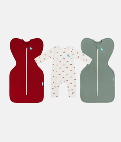 This Starter Bundle includes 1 x Swaddle Up™ 1.0 TOG Cotton Maroon, 1 x Swaddle Up™ 1.0 TOG Cotton Deep Olive and 1 x Romper Viscose from Bamboo Cream Bows