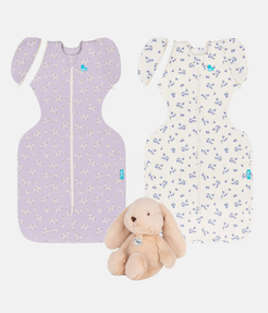 The perfect newborn gift for new or expecting parents. 1 x Swaddle Up™ Transition Bag 1.0 TOG Cotton Lilac Meadow, 1 x Swaddle Up™ Transition Bag 1.0 TOG Cotton Jacaranda Meadow and 1 x Toy.